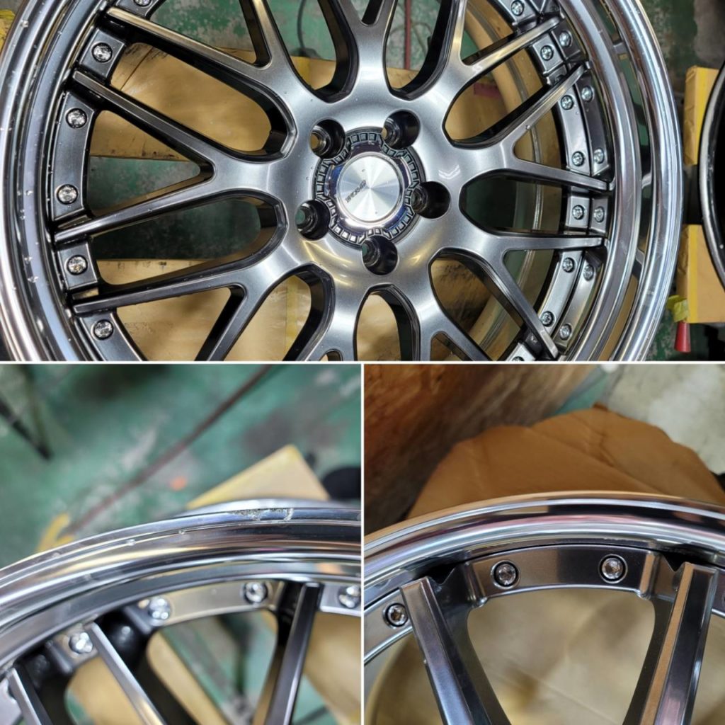 こちらのホイールは、リム部アルマイト被膜が処理されていますので、アルマイト被膜を一周落ち込み部分で切らせていただきガリキズ部分はにアルミ肉盛り溶接にて高さは保ち研磨仕上げで仕上げてあります。