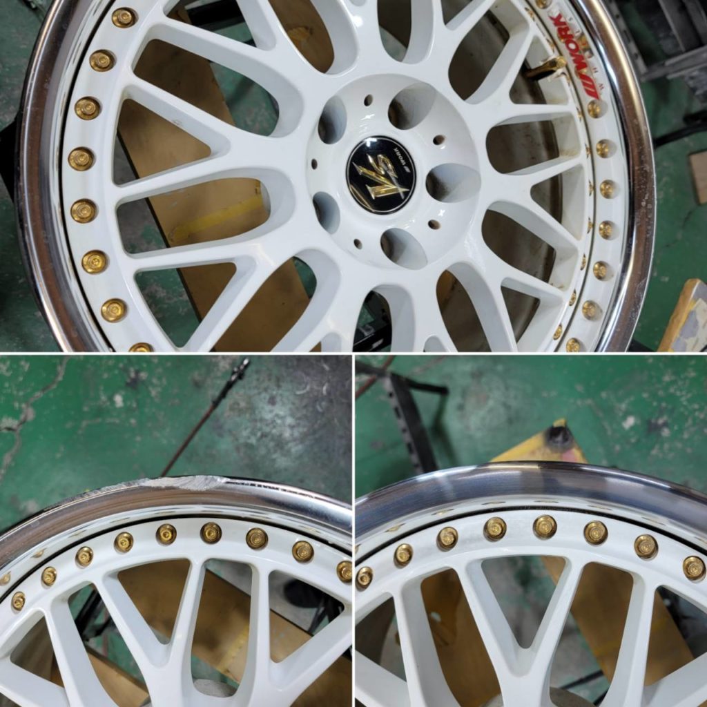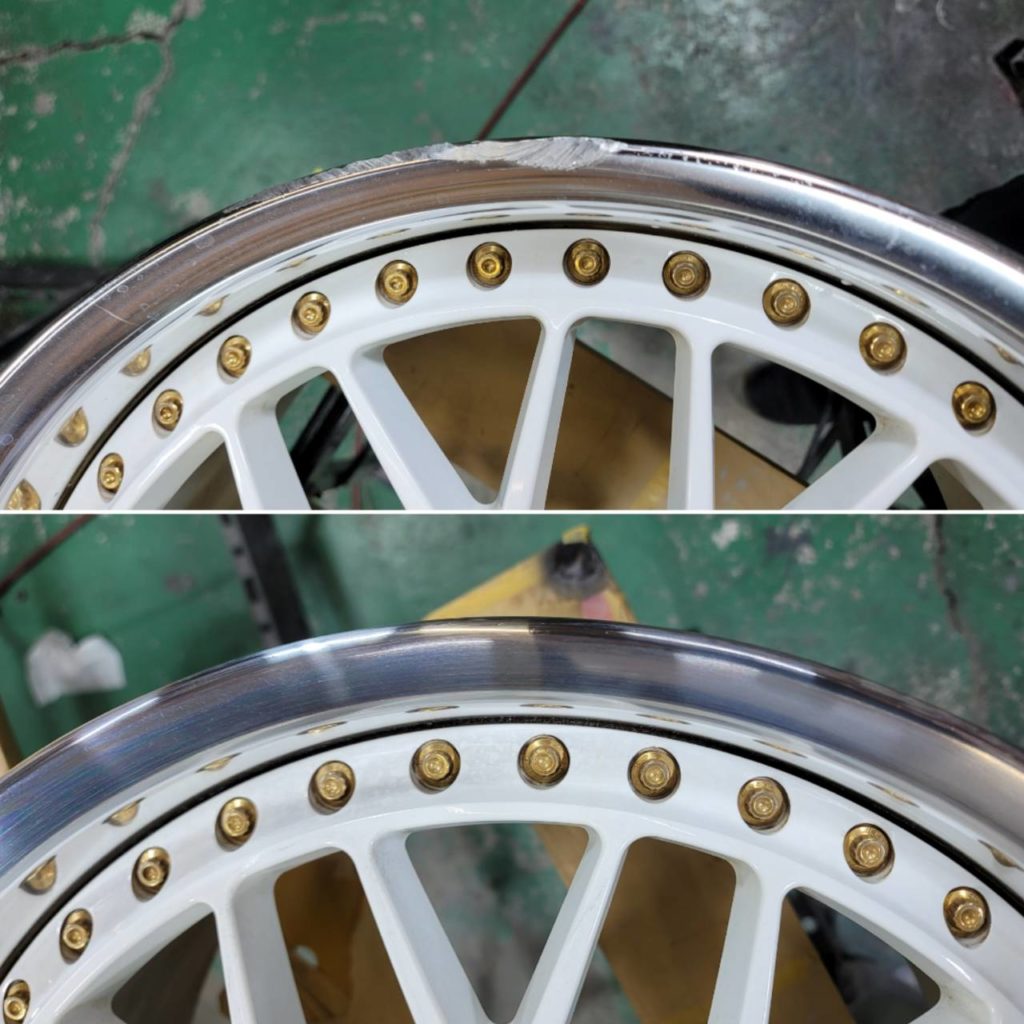このタイプのホイールで、ガリキズを削りだけで仕上げるとリムの高さが減ってしまい酷い場合施工箇所が下がってしまい見栄えが悪く仕上がってしまいます。