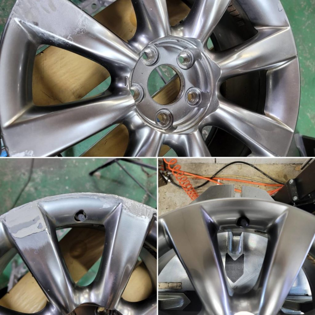 今回のお客様は、ハイパーシルバー塗装の自己補修済みのホイールの引き継ぎリペアになります。