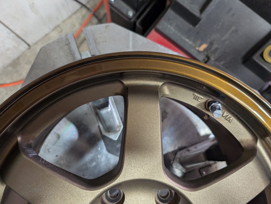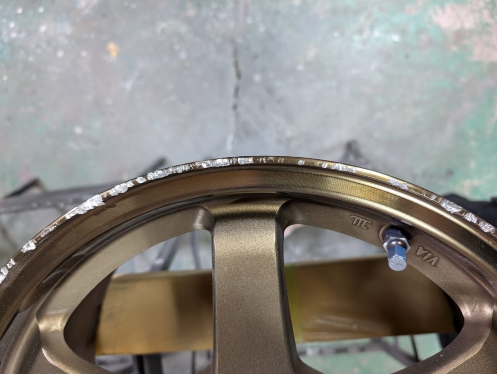 こちらのホイールは、ブロンズアルマイト施工がされたホイールになりますので、再アルマイト施工はできませんので、ガリキズをパテ埋めのちに色味を近づけた塗装で仕上げてあります。